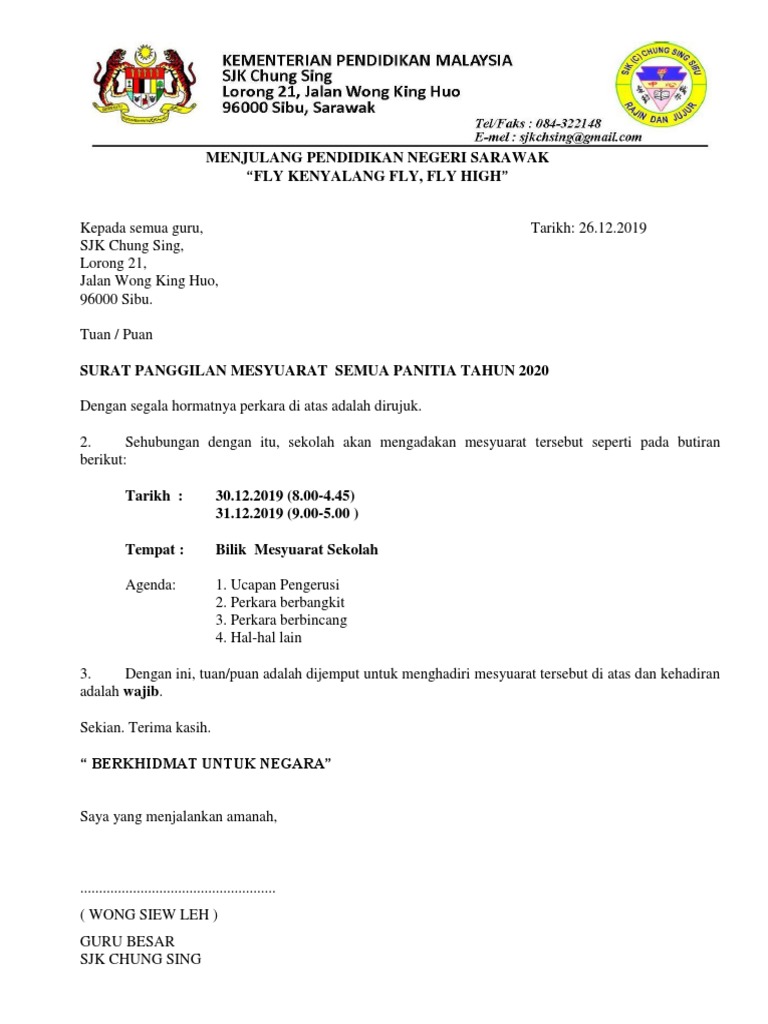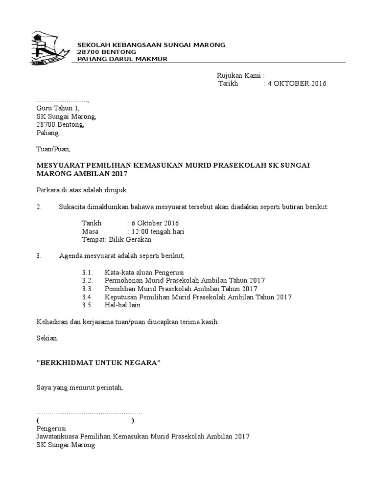 Surat Panggilan Mesyuarat Docx Document. Dengan segala hormatnya perkara diatas adalah dirujuk. RAKYAT DIDAHULUKAN PENCAPAIAN DIUTAMAKAN PERAK SENTIASA DI PUNCAK KECEMERLANGAN Ruj.
